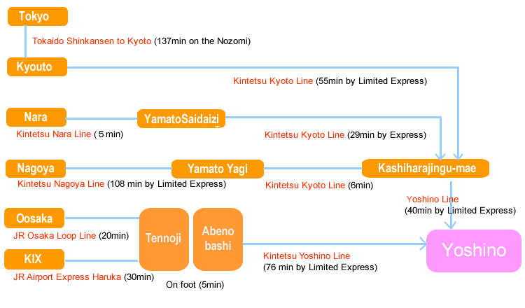 OsakaJR Osaka Loop Line (20 minutes) → Tennoji a 5-minute walk Kintetsu Osaka Abenobashi → Yoshinosen (limited express train: 76 minutes) → Yoshino