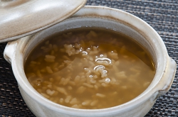 木綿の茶袋に焙じた粉茶を入れて炊き出し、冷やご飯を入れて炊いたものが、茶がゆと呼ばれます。